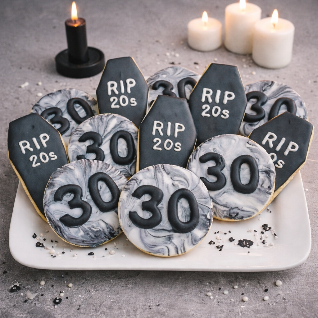 Bold “Death to 20s” cookies designed for a stylish 30th birthday celebration — playful and modern in tone.