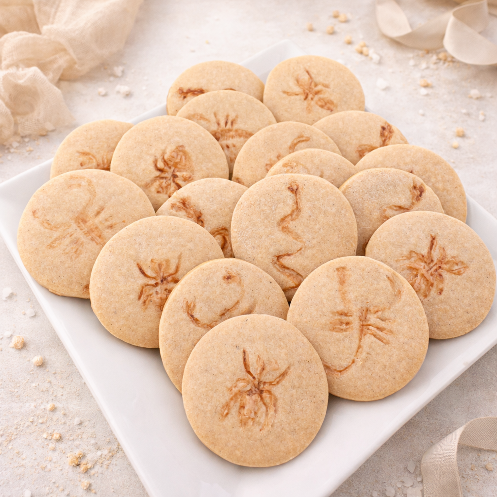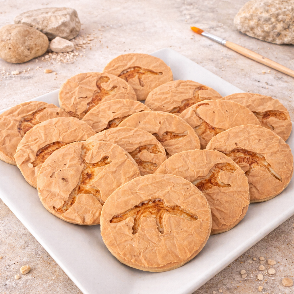 Fossil-inspired cookies created for a 50th birthday with an adventurous, Indiana Jones–style theme, featuring textured and embossed detailing.