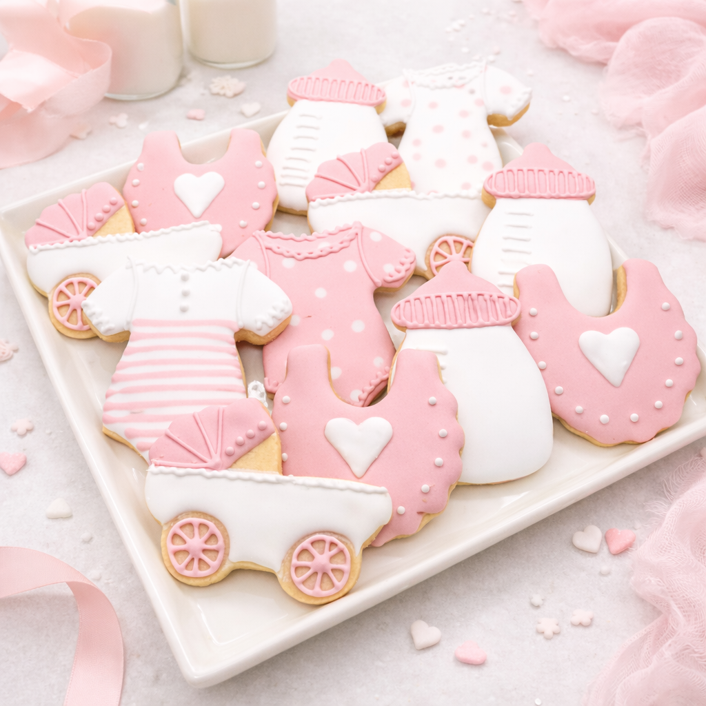 Baby girl celebration cookies in classic shapes with soft, timeless styling.