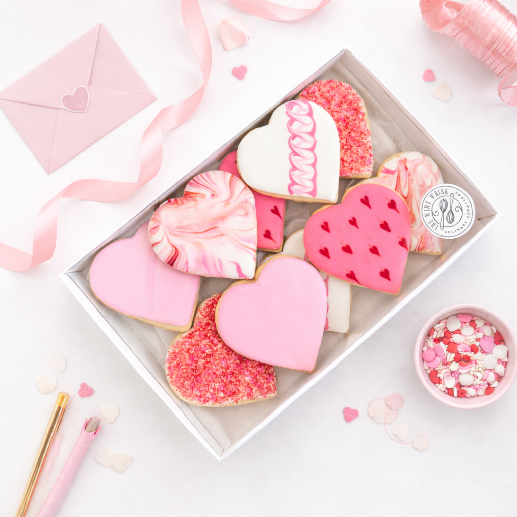 Valentine appreciation boxes featuring ten decorated cookies in soft seasonal tones — a sweet way to thank your customers.