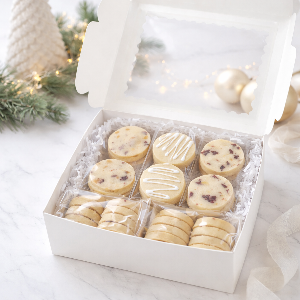 A curated shortbread collection featuring five flavours, six of each — an elegant and generous client gift.