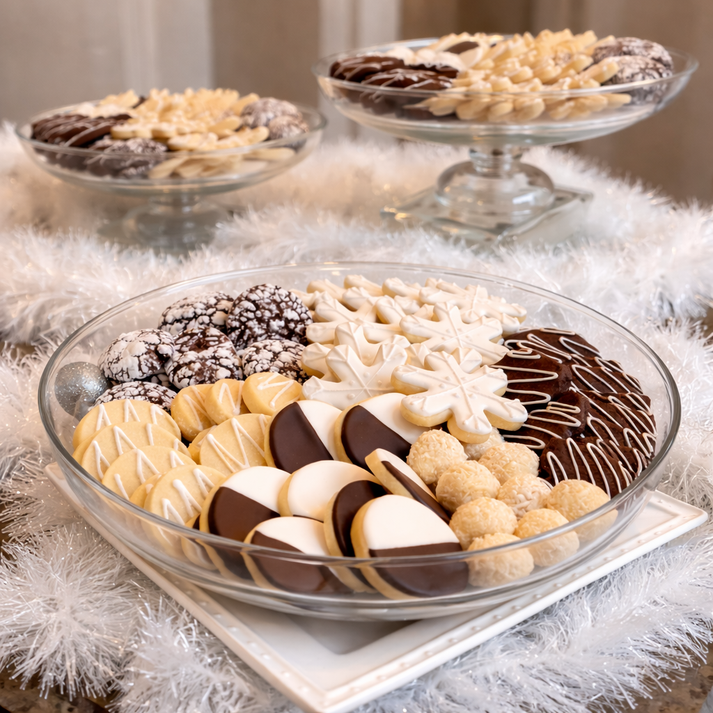 For a recent VIP event, a striking black-and-white spread featured two shortbread flavours, custom sugar cookie designs, chocolate crinkles, and coconut confections — a polished presentation designed to impress.